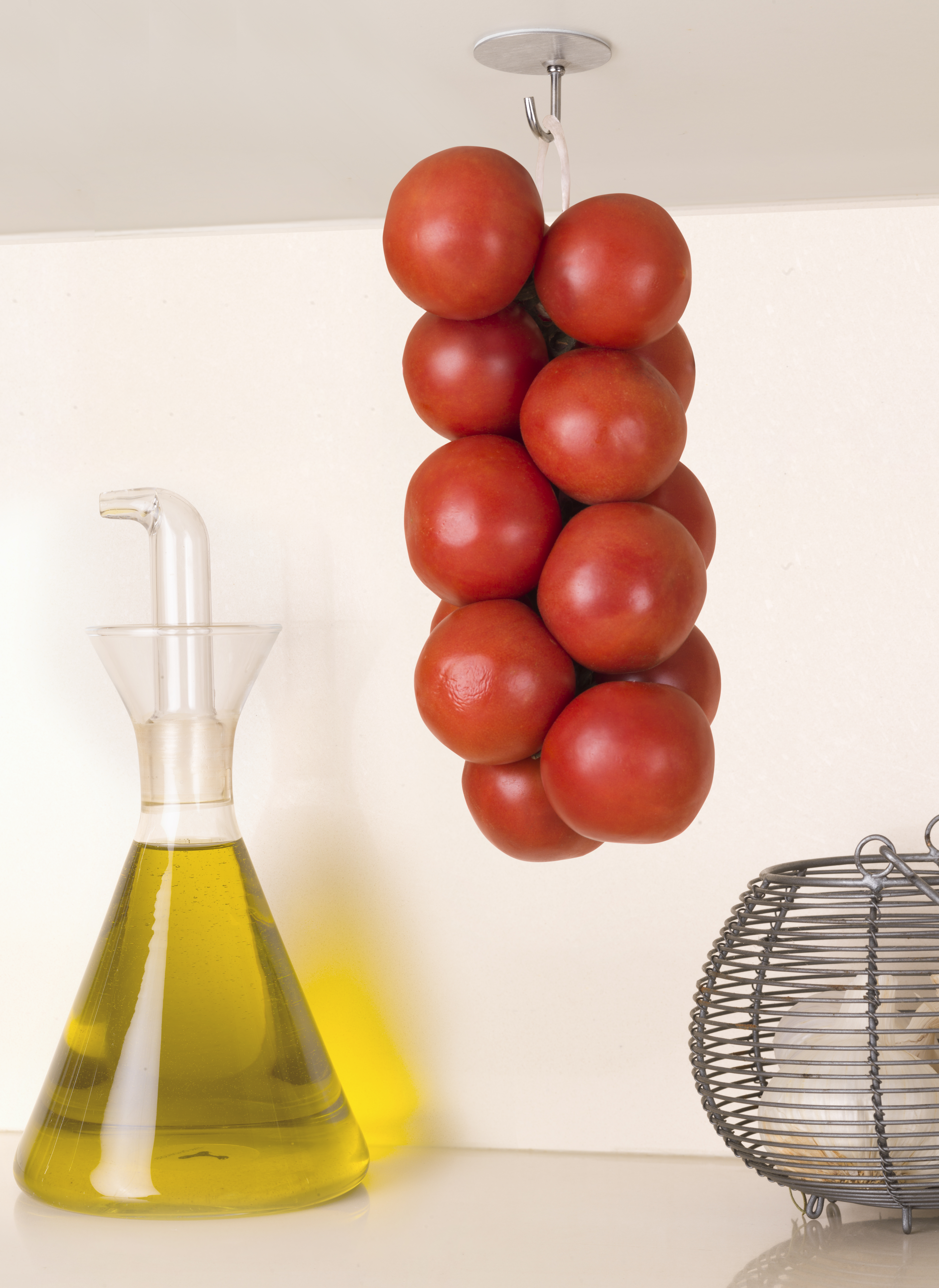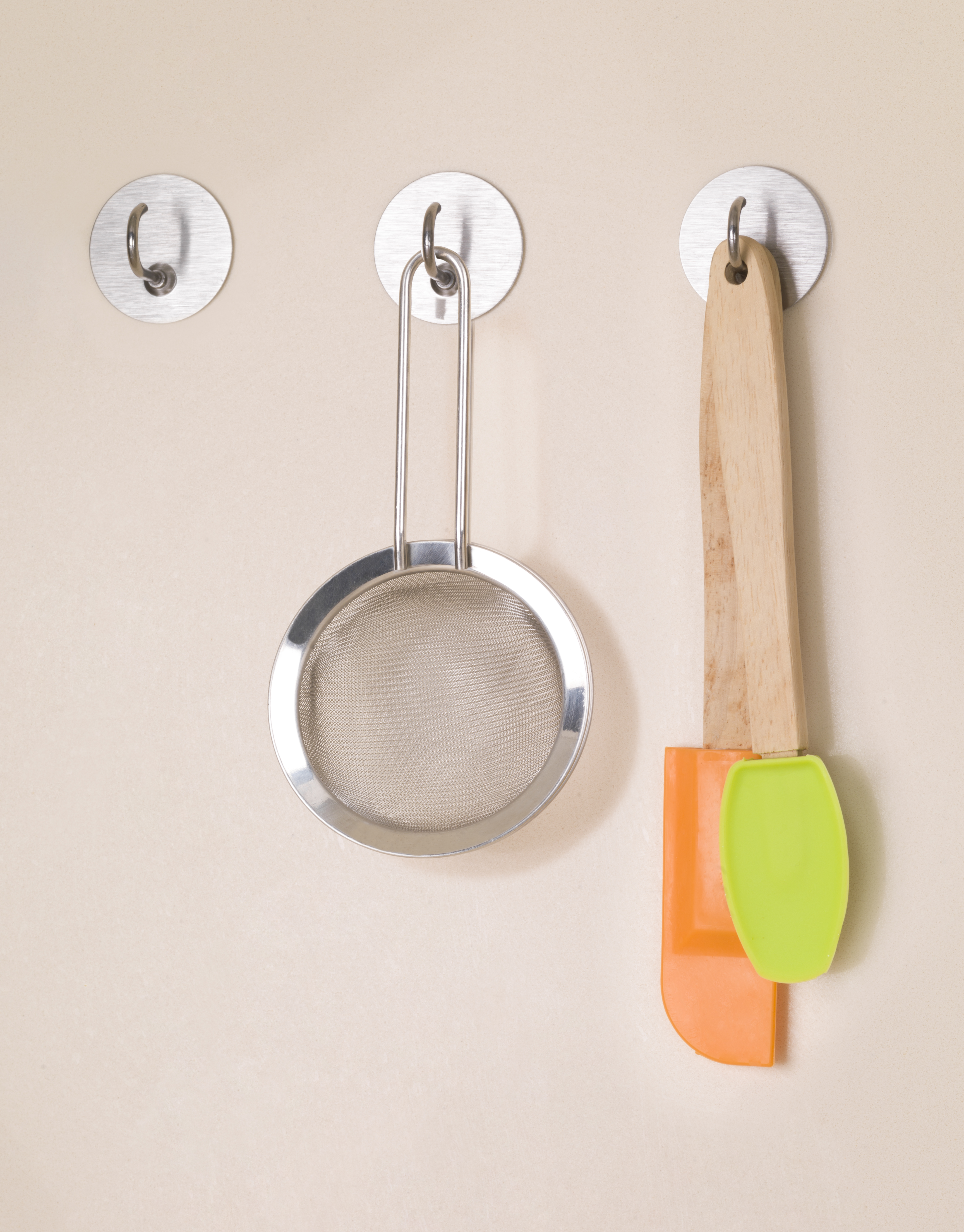 Solució per penjar tasses o altres estris de cuina. Pel seu ganxo en forma de femella oberta és ideal per ser fitxat en la part inferior de prestatges i armaris de cuina.