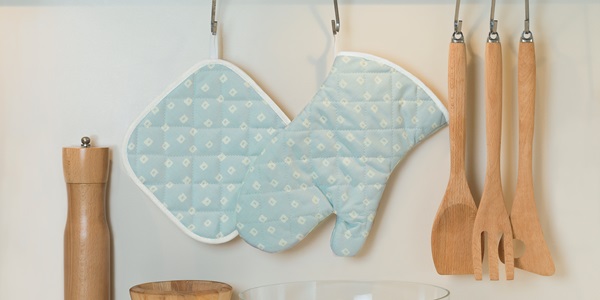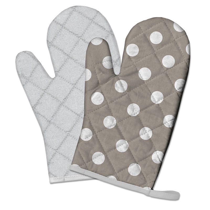 Guants per a la cuina de 30 x 18 cm, confeccionats en teixit 100 % cotó estampat de material auto extingible. Perfectes per no cremar-se a l'hora de retirar recipients del foc o del forn.