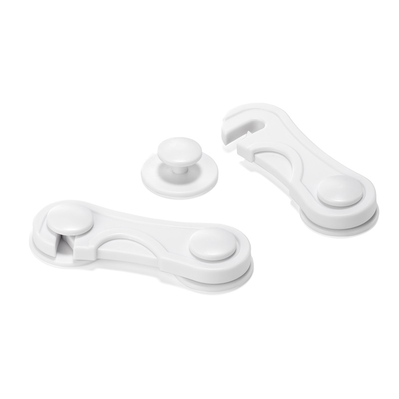 Front safety lock with latch, adhesive bonding. Increased product safety, as the lower button must be pressed while pulling upwards to release the latch.