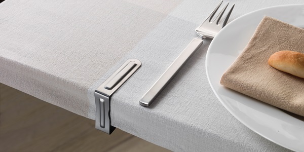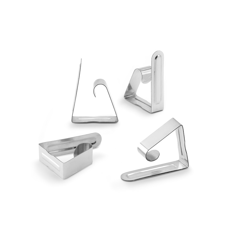 Pinza sujeta-mantel fabricada en acero inoxidable para poner en cada uno de los lados del mantel para sujetarlo a la mesa. Accesorio muy práctico y de gran utilidad ya que evita que el mantel o tapete se vuele con el aire.