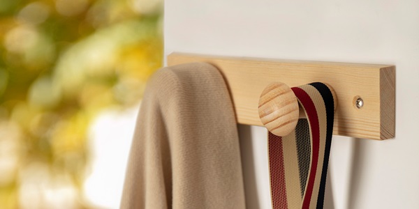 Colgador de madera de pino con 2 pomos. Producto con certificación PEFC.